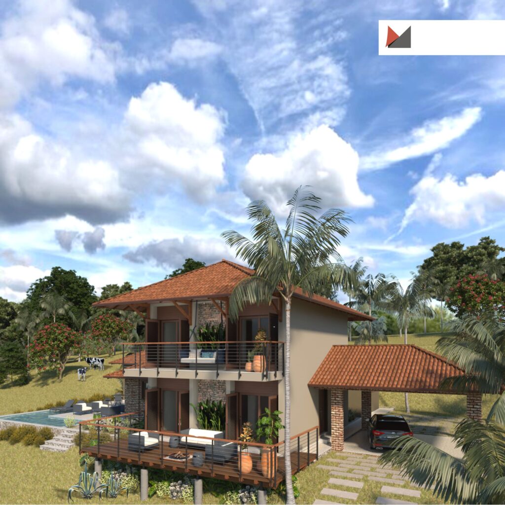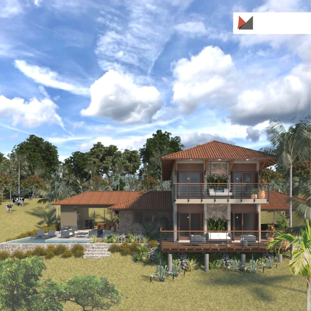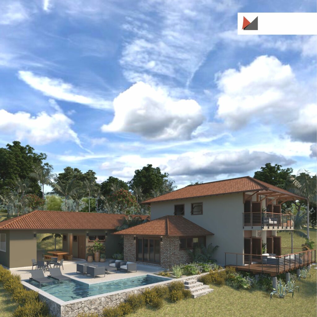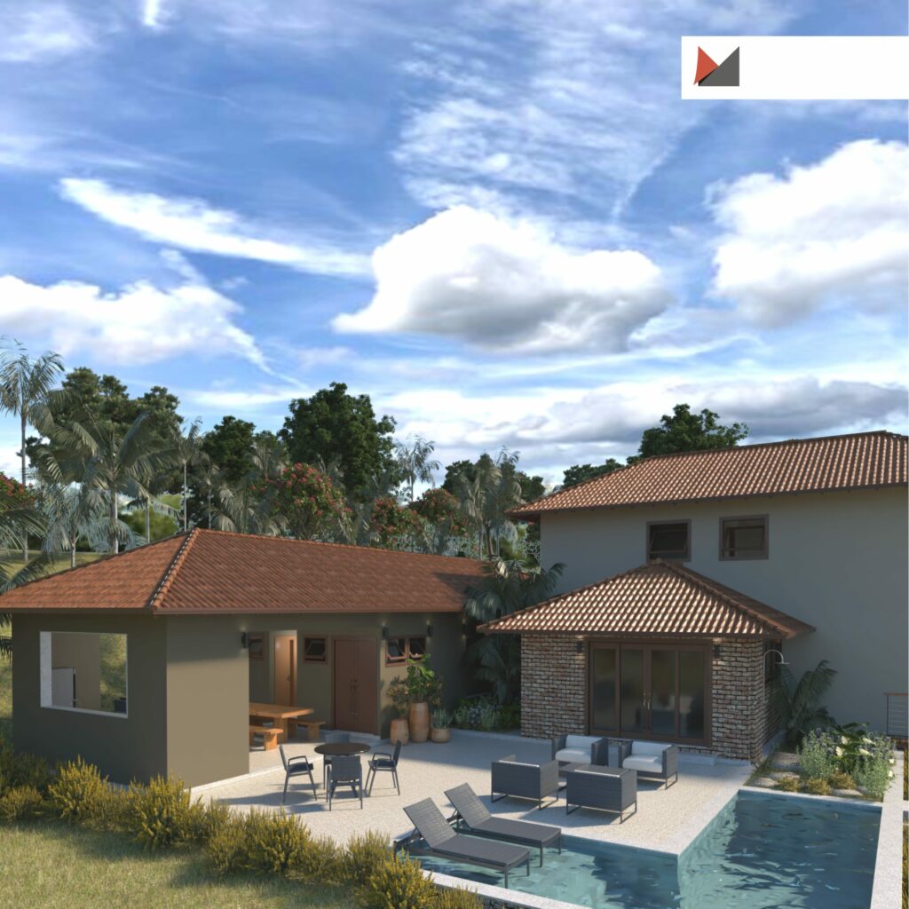 Através do projeto arquitetônico podemos desenvolver vários estudos e possibilidades para alcançar a melhor maneira de aproveitar o espaço disponível e as condicionantes que o cercam: paisagem, insolação, ventilação, entorno, etc. Para o terreno na área rural de Viçosa foi desenvolvida uma planta com dois pavimentos – no térreo concentramos a área social (sala de estar, jantar, cozinha, lazer) serviço e quartos. Estes foram encaixados nos fundos para ter maior privacidade e também para aproveitarmos a maior parte da insolação na área da piscina durante todo o ano. Criamos também como lazer um salão com churrasqueira/sinuca, que está integrado com a área social da casa.